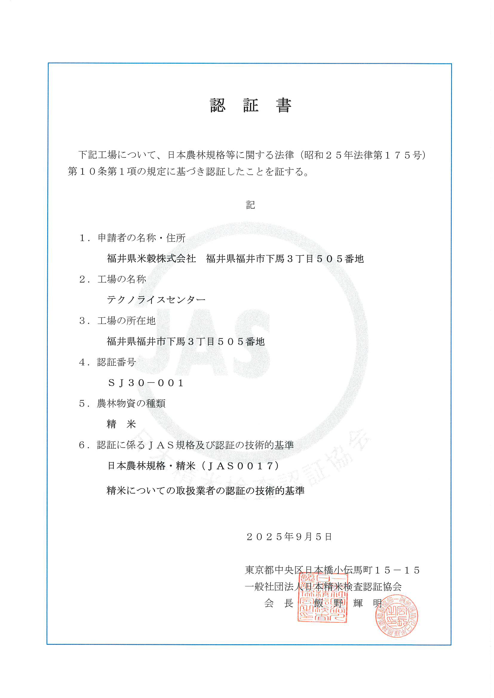 弊社は、一般社団法人日本精米検査認証協会による「精米JASの認証」を取得いたしました。